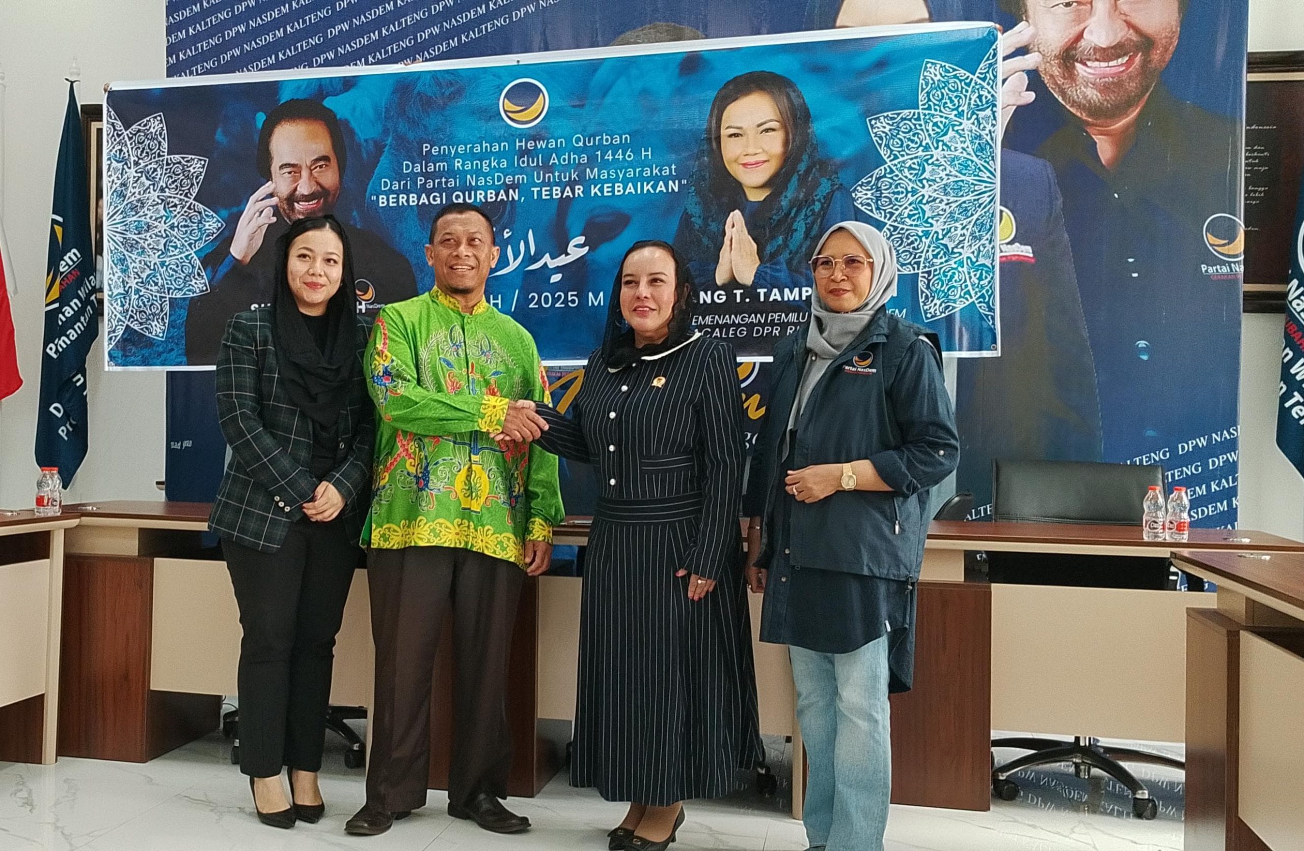 Ketua DPW NasDem Kalteng, Faridawaty Darland Atjeh, menyerahkan sapi kurban tersebut secara simbolis kepada tiga orang perwakilan dari Dapil I, Dapil III, dan Kelurahan Bereng Bengkel. Acara berlangsung khidmat dan penuh suasana kebersamaan.